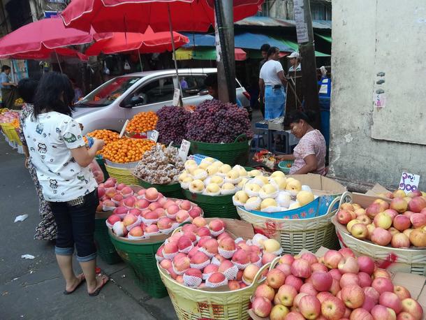 写真は、いつも作業しているカフェの近くで、売られているフルーツ売り場です。ミャンマーでは、色々な人が1箇所(ストリート)に集まって、商品を売っています!