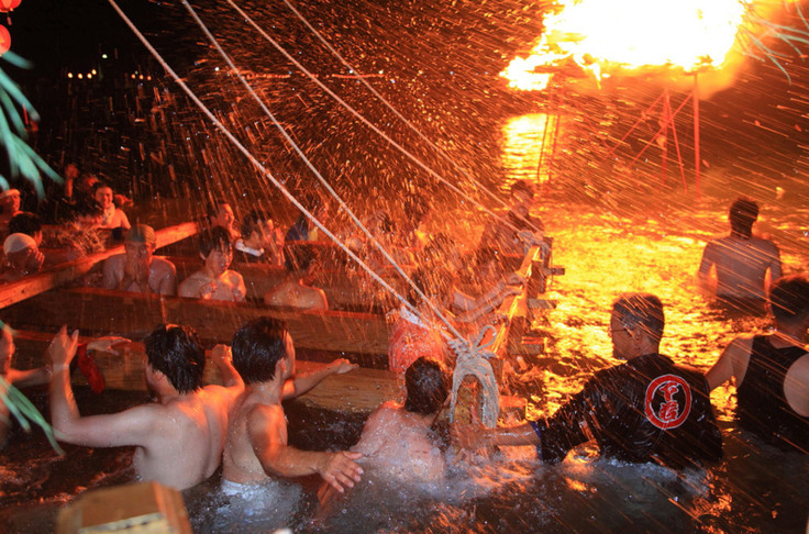 高さ約14メートルのキリコを、約100人で担いで巡行し、見附(みつけ)海岸に勢ぞろいしたキリコが、打ち上げ花火を合図に、沖合20~30メートルに設置された松明を目指して一斉に海に入ります。