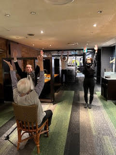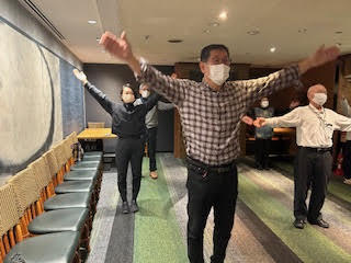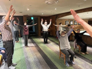スタッフの方の合図に合わせて、みなさん体を動かします。