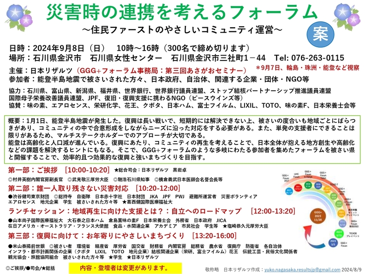 この度、9月8日(日)に「GGG+フォーラム 災害時の連携を考えるフォーラム ~住民のやさしいコミュニティ運営~」
