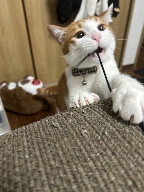 大好きなゴムで遊んでます。ソファは見ての通り爪研ぎでボロボロなりました(笑)