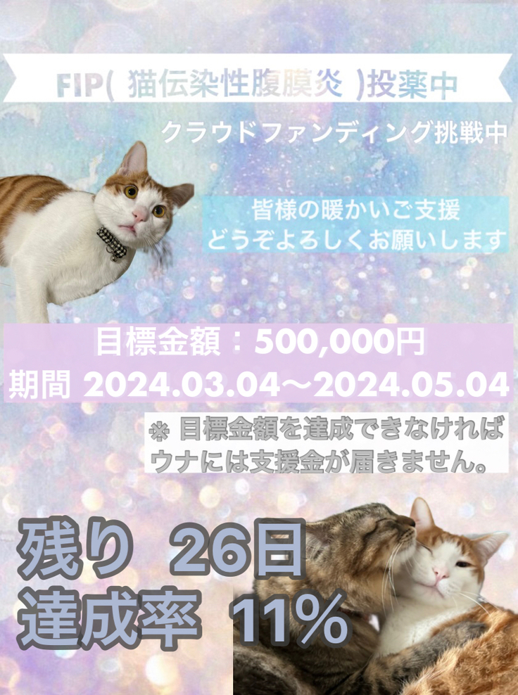 達成率は11%です。心苦しいお願いばかりにはなるのですが、ウナ のために皆様のご無理のない範囲でお力を貸していただけないでしょうか。