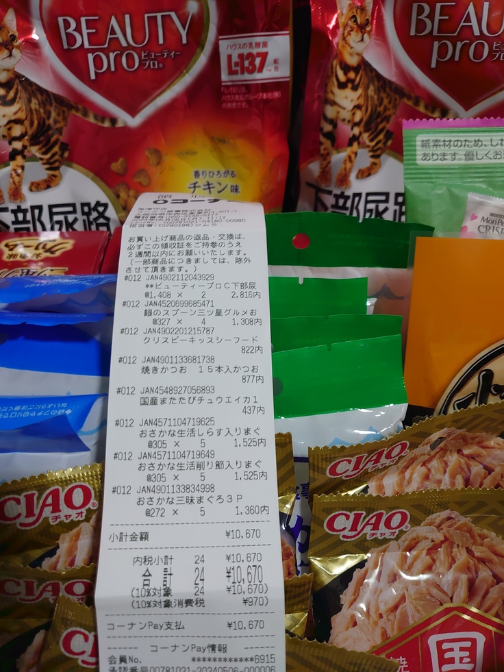 コーナンに行って支援金でにゃんこのご飯を購入させて頂きました。