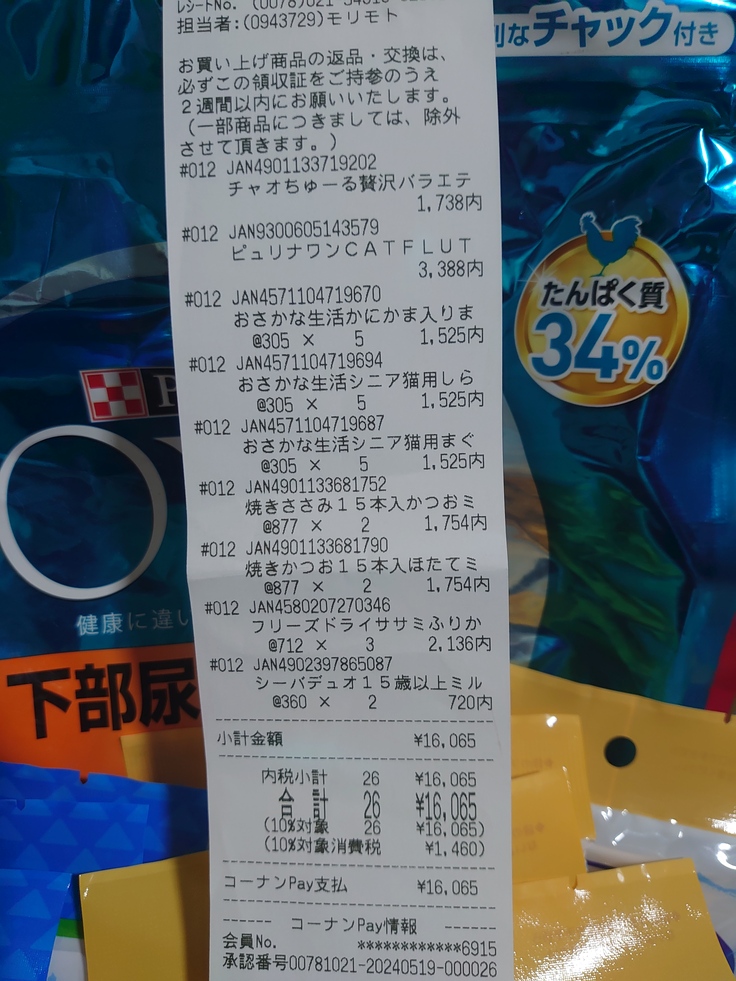 チロル診察5060円−私の管理してる猫の駆虫薬6050円−
