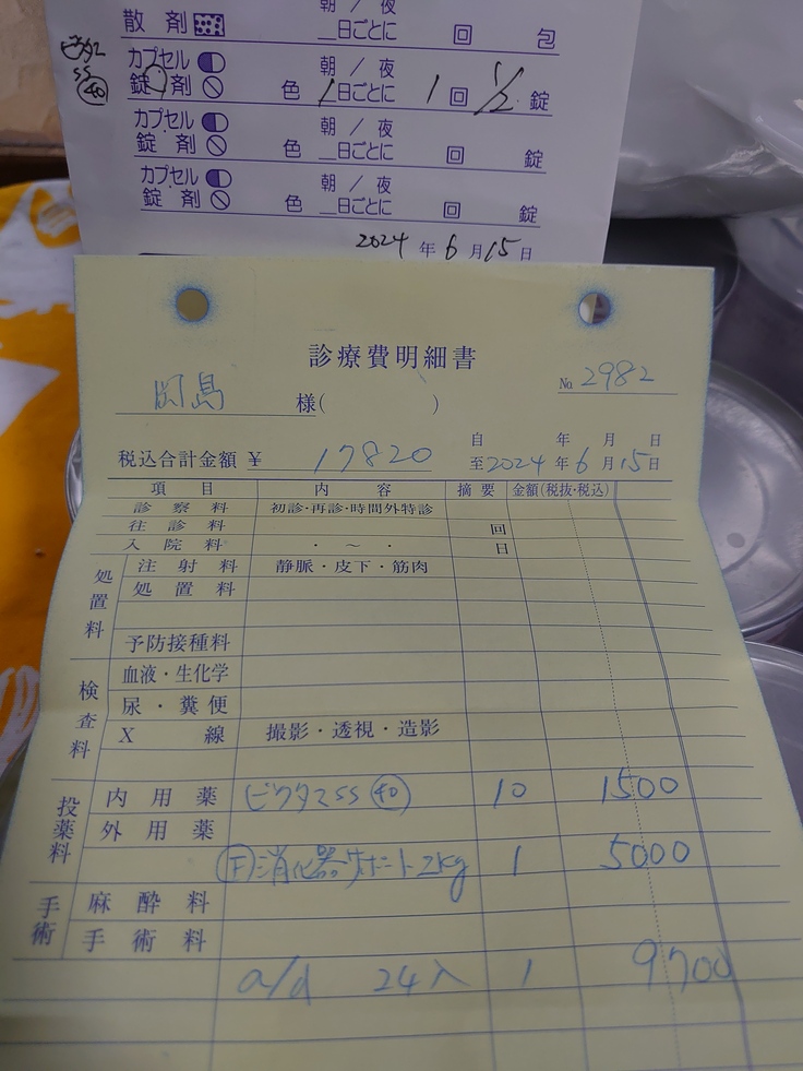 支援金残金224962−6月12日フード購入品4573−6月15日病院での支払い合計17820=202569