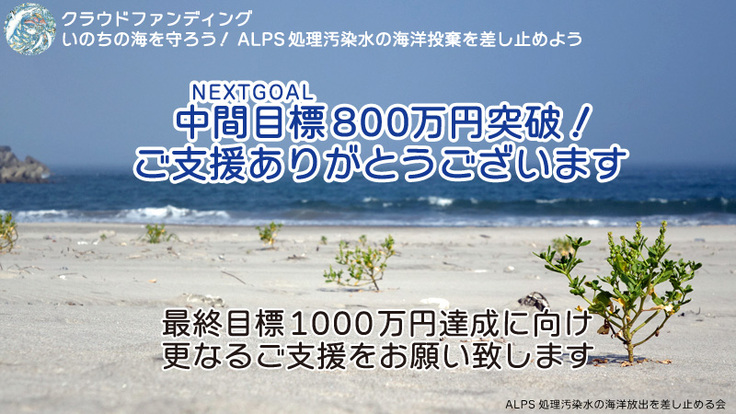 「いのちの海を守ろう!ALPS処理汚染水の海洋放出を差し止めよう」クラウドファンディングは、皆さまの温かいご支援のおかげで、中間目標の800万円に到達することができました。心から感謝申し上げます。本当にありがとうございます。