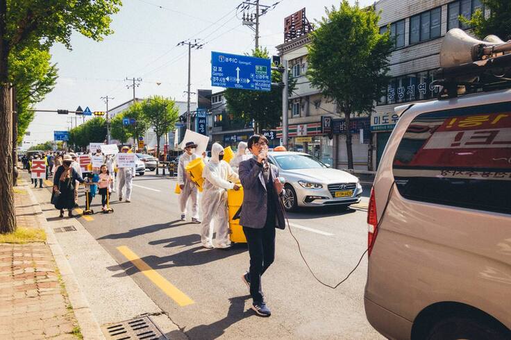私は慶州(キョンジュ)の月城(ウォルソン)原発で反核脱原発活動をしています。原発周辺の住民と甲状腺がんの共同訴訟をしてから、もう10年になりました。残念ながら、甲状腺がんの共同訴訟は1審、2審とも敗訴し、現在最高裁判所に係留中です。訴訟の原告は韓国の4つの原発立地地域の半径10キロメートル以内に5年以上居住した後、甲状腺がんの手術をした被害者618人とその家族です。疫学調査で原発周辺住民の甲状腺がんの発病率が原発周辺以外に居住する住民よりもはるかに高いことが明らかになったものの、原発から排出される放射性物質の量が年間被ばく基準値である1ミリシーベルト以下という理由で裁判所は原告の主張を棄却して、核・原子力産業界の味方をしました。