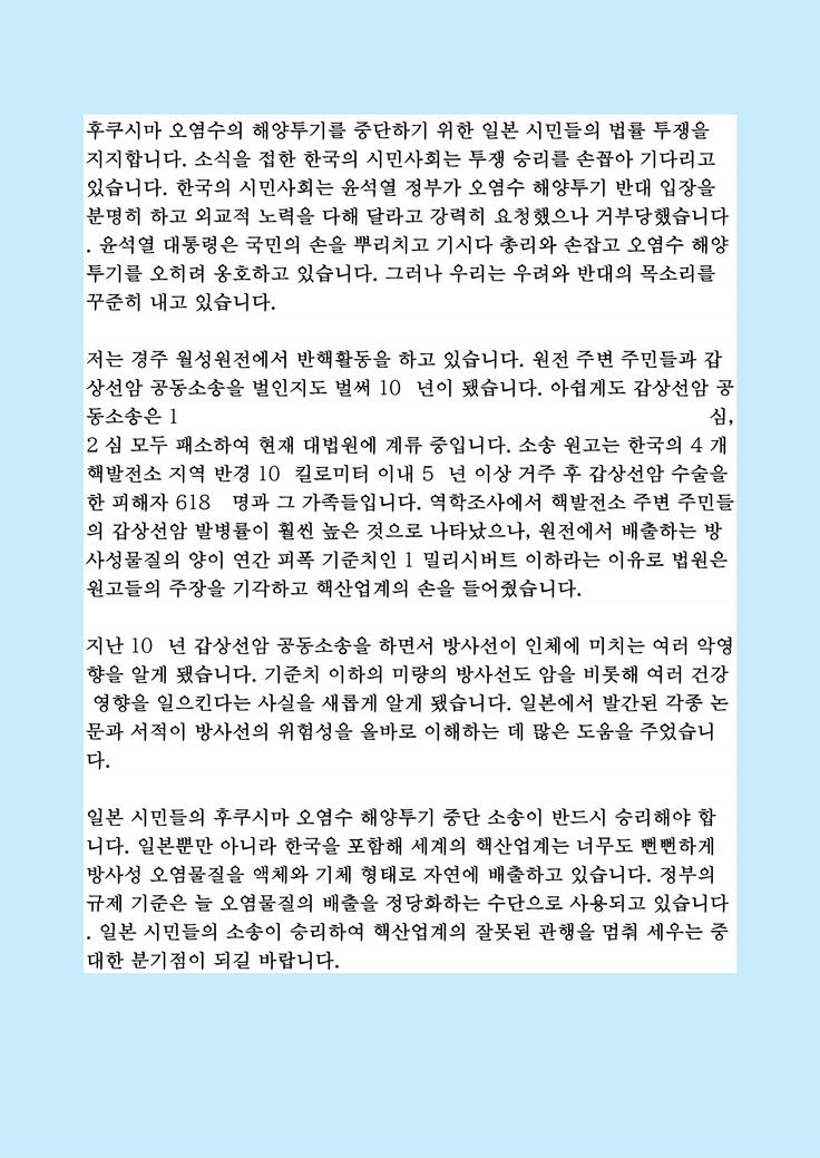 日本の市民による福島原発汚染水の差止訴訟は、必ず勝利しなければなりません。日本だけでなく韓国を含め、世界の核・原子力産業界は図々しくも放射能汚染物質を液体と気体の形で自然に排出しています。政府の規制基準は、常に汚染物質の排出を正当化する手段として使用されています。日本の市民の訴訟が勝利し、核・原子力産業界の誤った慣行を止める重要な分岐点になることを願っています。