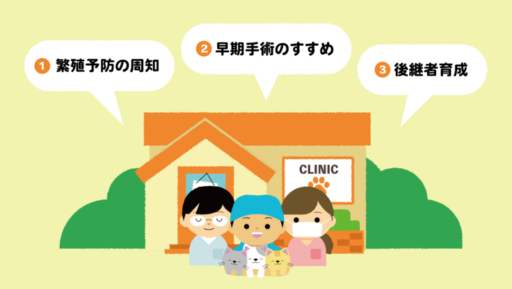 猫の繁殖力は高いため、持続的な活動が重要になってきます。当院での繁殖予防の取り組みにとどまらず、今後の何世代にわたっても守っていけるように、後継者の育成にも励んでまいりたいと思います。
