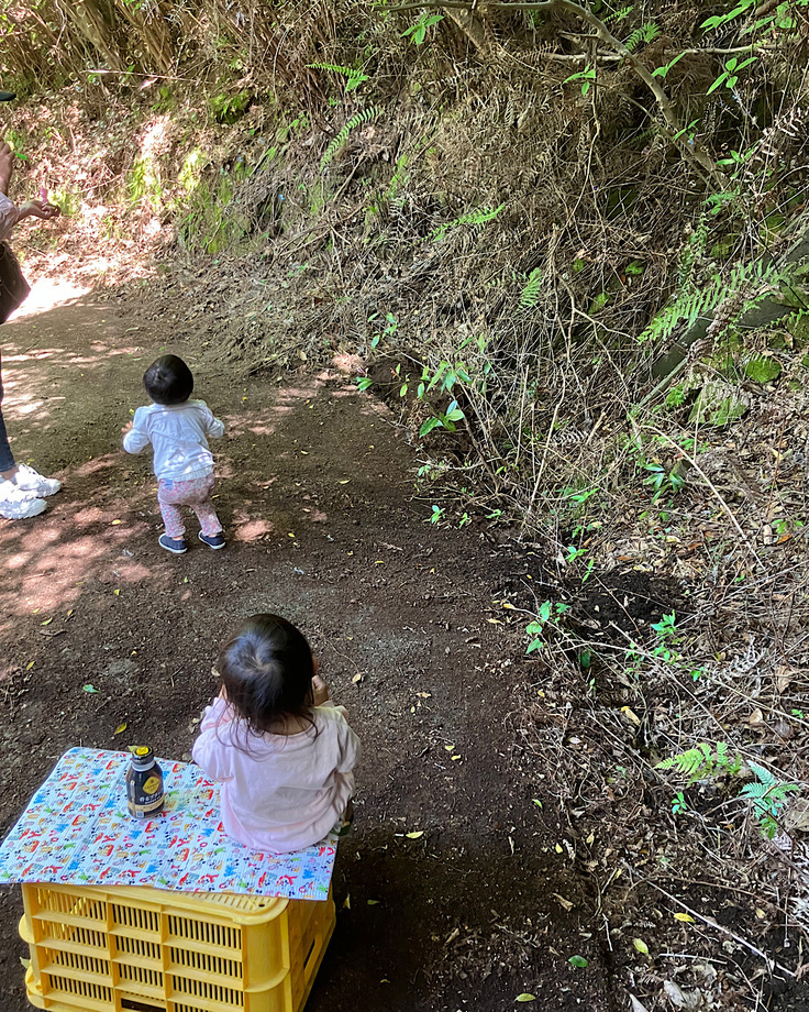 三叉路の広場でコンテナ置いて、お菓子タイム。