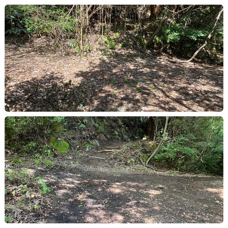 上のbefore写真は初めて三叉路まで入った日のものです。左右に舗装道が続き、その間に歩道跡がありました。