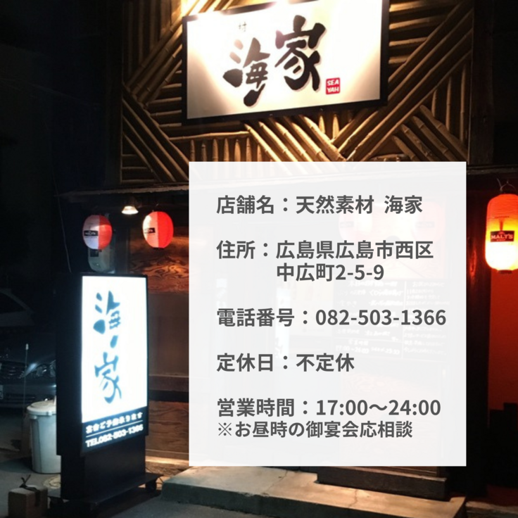 広島市西区中広町で「天然素材 海家」と言う海鮮居酒屋を営んでおります、