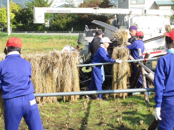 もち米種籾からの苗作り・苗を育てて田植え・田植えを終わってからの草取り(ころばし)・土手の草刈り(保護者がします。)・稲刈りとかけ干し・脱穀です。農薬不使用です。