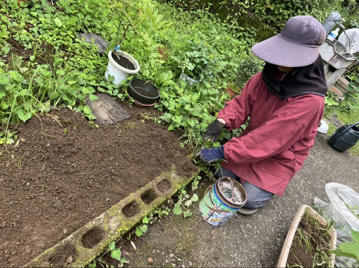 この花壇は苔とドクダミと雑草だらけなので、手前の方から順番にひとつひとつ草抜きします。