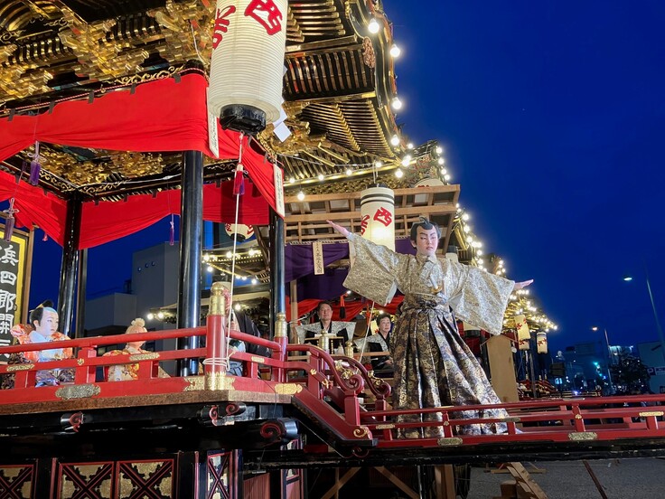 お祭りの中日に曳山を1か所に集め、多くのお客様の前で子供たちの上演します。