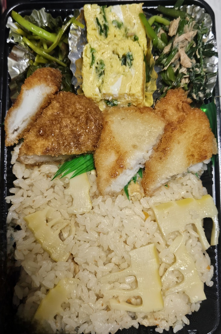 タケノコご飯、せりはツナとわさび、かき醤油で和え、三つ葉はおかかとまろやかポン酢で、ニラ入りだし巻き玉子など