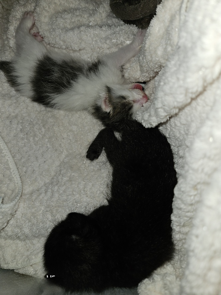 抱えながら、里へ…いたよー⤴️思わず大きな声で叫んでしまいました! cocoちゃんの赤ちゃんです!白黒の赤ちゃんが、産まれて数日後確認した時から、だいぶ小さかったので、見つけた時も後から産まれたミルキーの赤ちゃんと変わらない位でした。