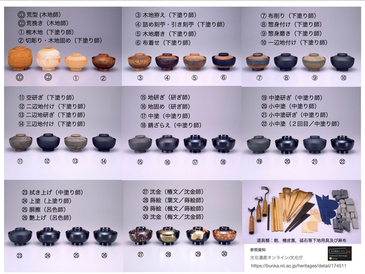 124行程を異なった技術を持つ“7〜8人の職人さん達がそれぞれの工程を受け持ち、品質を維持する為に、技法や素材にも細かい規定が設けられており、完成までに半年から一年、またはそれ以上の期間を要し、それらの工程を遵守した物だけが『輪島塗』として認められるのです。