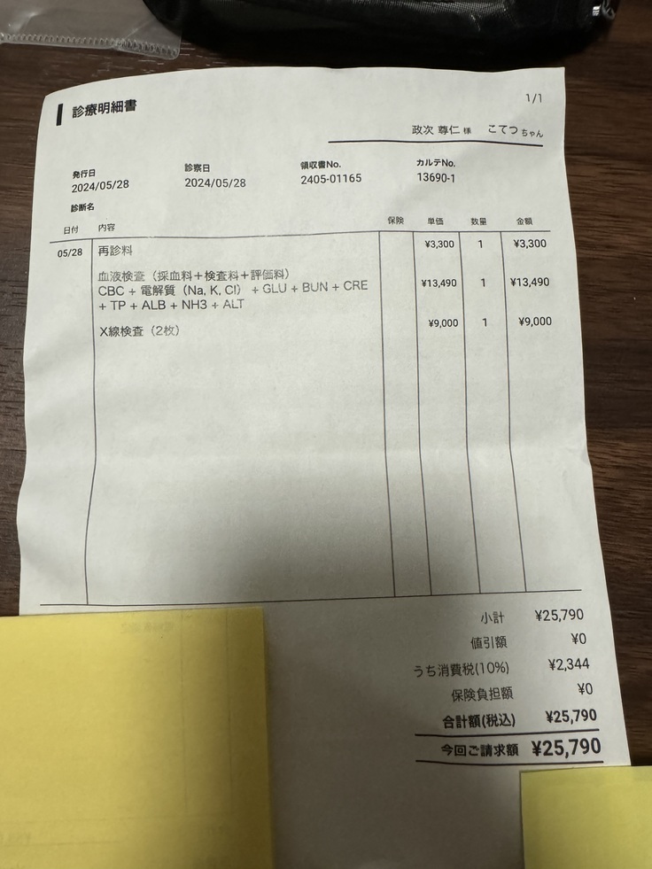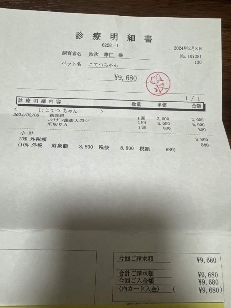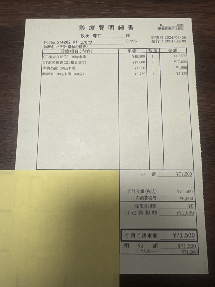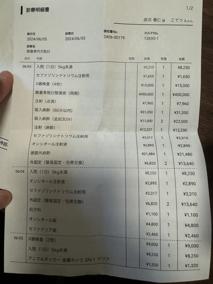 上記の説明を受けた上で、一度に¥650,000の手術費用は高額ではありますが、手術による『こてつ』の体への負担を考慮し、一度でまとめて手術を受けることに決めました。