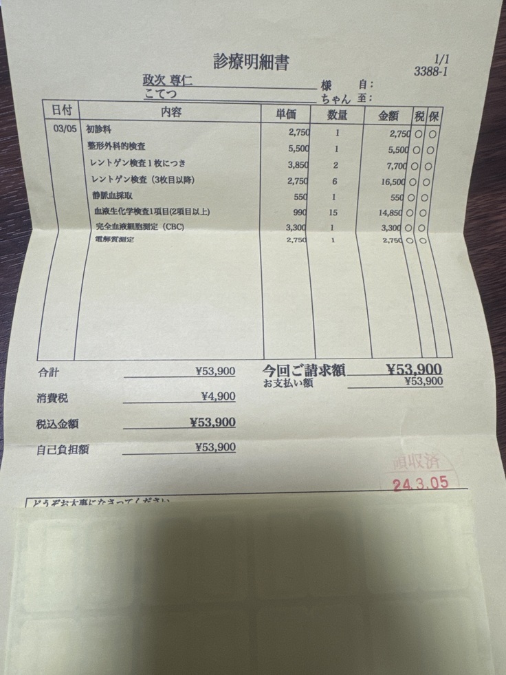 ・大腿骨の変形はなく通常手術で対応できるためかかったとしても費用は¥650,000程度。