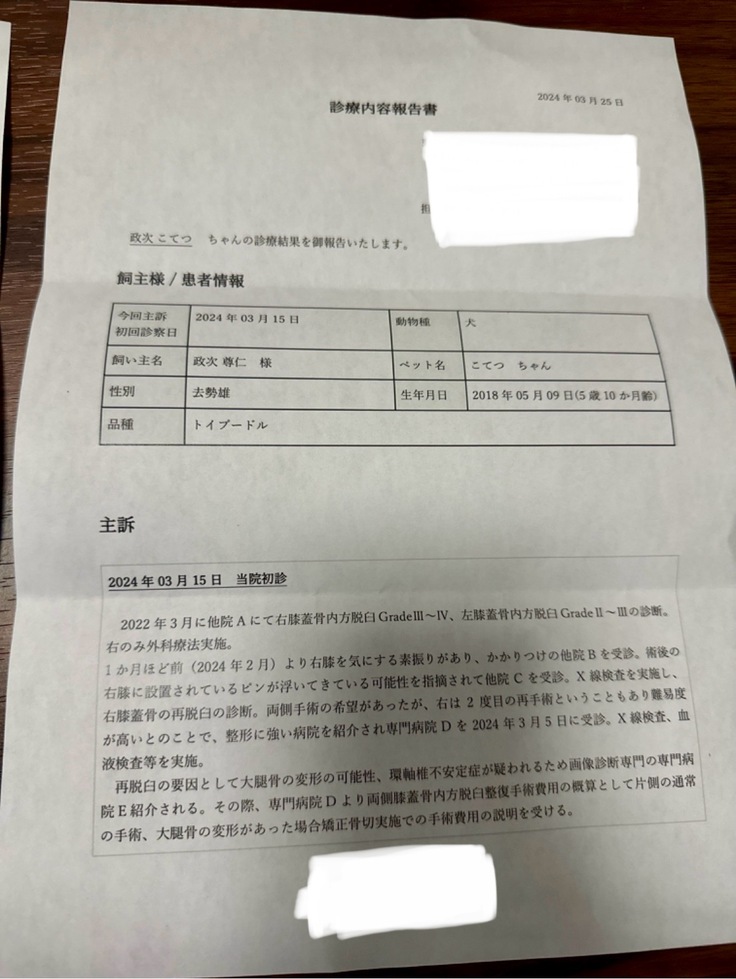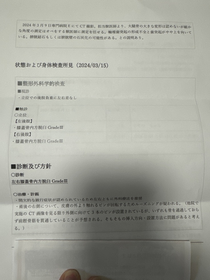 お迎えしてすぐの健康診断の際、膝蓋骨脱臼(パテラ)の診断を受けました。