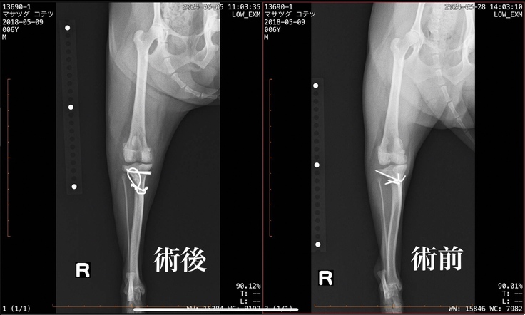 ・前の右膝の手術で挿入したピンが通常は内側に向けて挿入されるべきものが、外側に向けて挿入されているため機能しておらず、触るとクルクルと回ってしまう状態。そのため一度手術した場所も再度手術が必要。