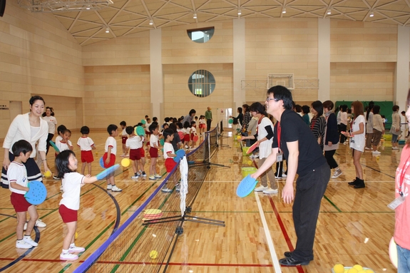 (幼稚園・保育園園児向けマナーキッズ親子てのひらテニス教室の様子)