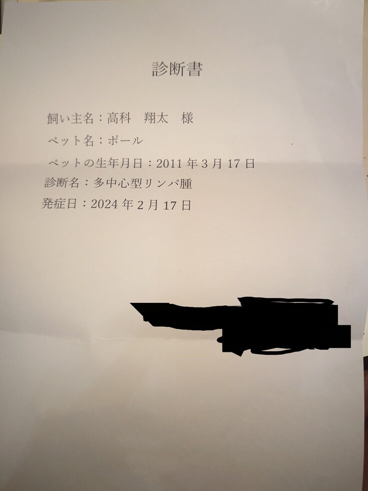 1週間ほど前から首のリンパが腫れていて、様子を見てたが日に日に腫れが大きくなってきたため2月16日に病院を受診しました。結果、悪性リンパ腫(多中心型)で治療しないと1ヶ月ほどと医師より余命宣告されてしまいました。少しでも一緒にいたいと思い抗がん剤治療をすることにより医師より一年ほど余命が伸びる可能性があると言われた抗がん剤治療を行っています。