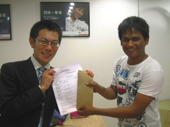 HISダッカ支店にて浦田さんより初の海外航空券をゲットするマヒン。