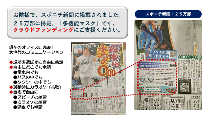 お陰様で、スポーツニッポン新聞に「次世代・多機能マスク」が掲載されました。