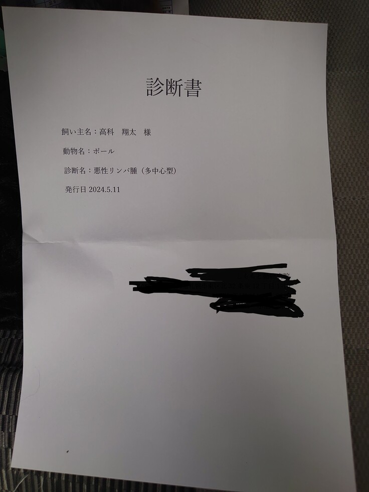1週間ほど前から首のリンパが腫れていて、様子を見てたが日に日に腫れが大きくなってきたため2月16日に病院を受診しました。結果、悪性リンパ腫(多中心型)で治療しないと1ヶ月ほどと医師より余命宣告されてしまいました。少しでも一緒にいたいと思い抗がん剤治療をすることにより医師より一年ほど余命が伸びる可能性があると言われた抗がん剤治療を行っています。