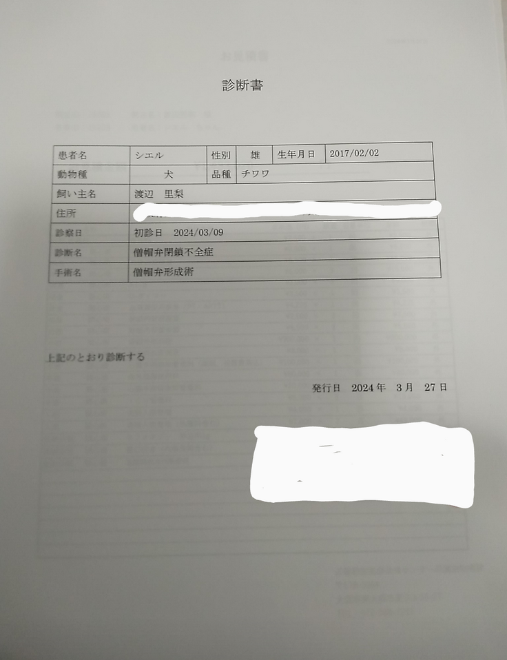去年の12月に【僧帽弁閉鎖不全症】と診断され、今年の3月9日に獣医師からの説明で、Cielの心臓の状態と、ピモベハート(強心剤)が効いていない可能性もあり、Cielの状態は命の危険があり、手術適応と診断されました。