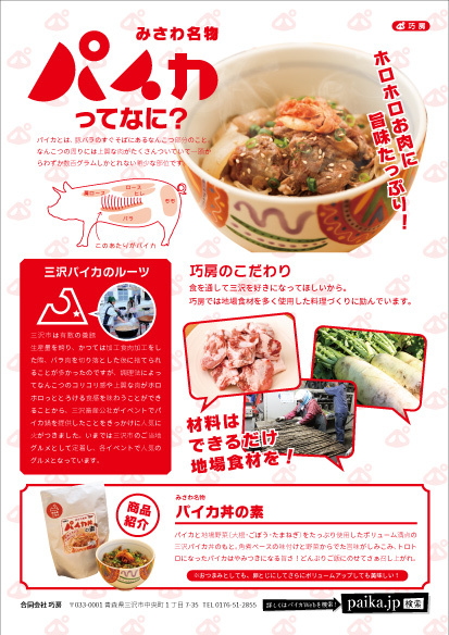 ・この頃パイカは一般にはあまり知られておらず馴染みのない食材だった。これに特産野菜の大根、人参、牛蒡(生産量日本一)を使用して出来た第一号が「パイカ丼の素」!醤油ベースで味付けし、キムチを乗せて仕上げる。これも最初は醤油が焦げたり肉が固かったりの失敗を何度も繰り返しながら試行錯誤しての物だった。レトルトとは120度の温度で加熱殺菌するとてつもなく過酷な温度帯の煮物みたいな物!だがらこそ難しいけど安心安全な食品となる。現在ではその他にパイカカレー・パイカミートソース・パイカ鍋等色々な味に変化させレトルト食品としての種類を増やしている。また食感を変えて食せる物としてパイカ餃子を開発、煮込み時間によって変わる特徴があるパイカのコリコリした軟骨が面白く美味しい(冷凍なので今回とは関係ありませんが紹介だけさせて下さい。)