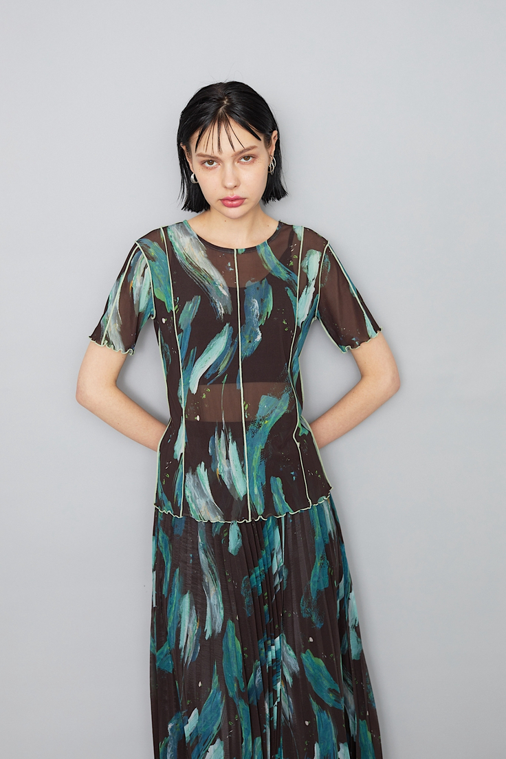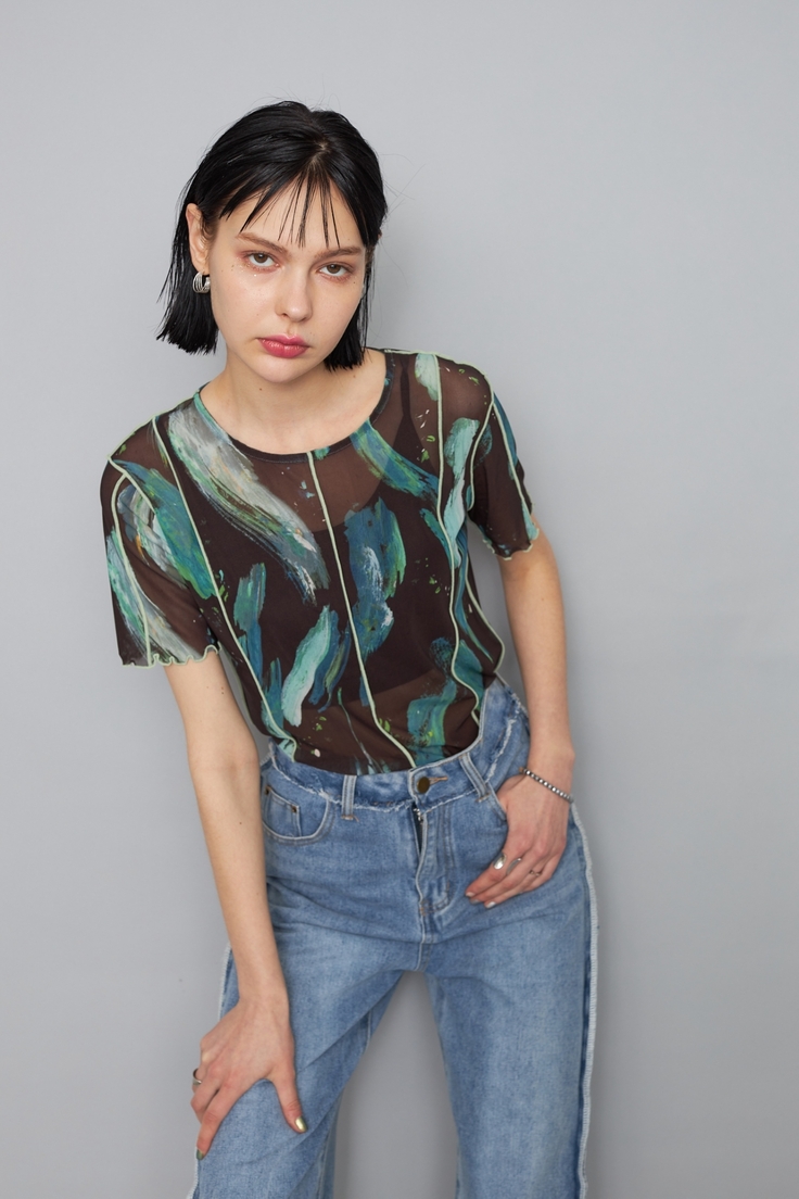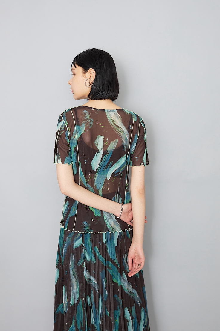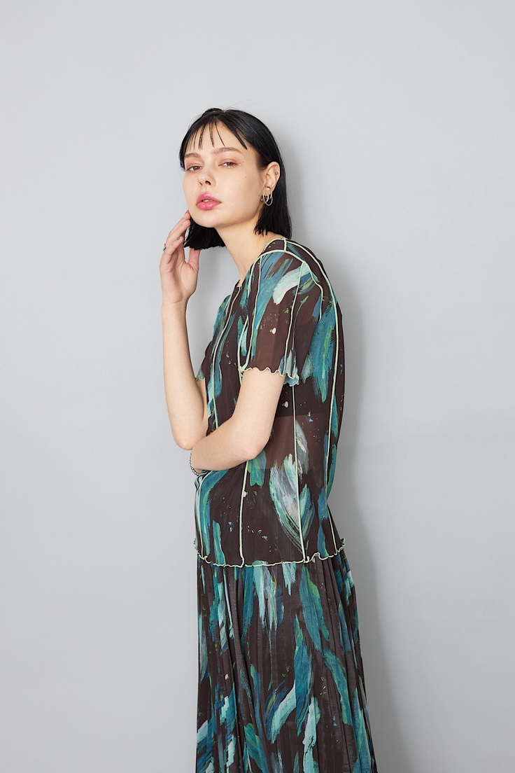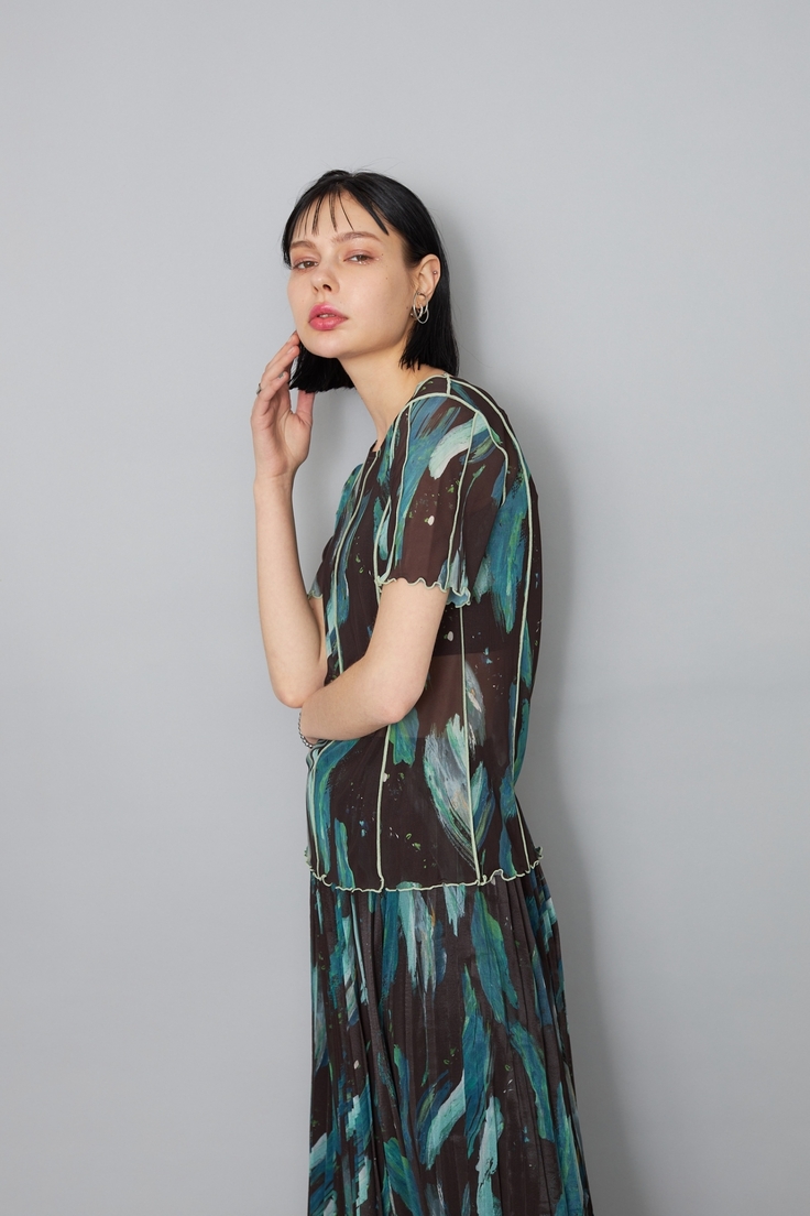 透け感のあるシアー素材にオリジナルのニュアンスアートをプリントしております。