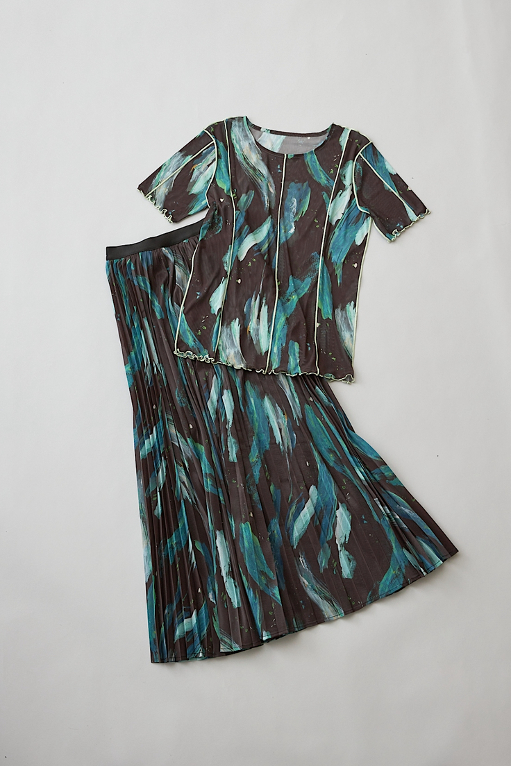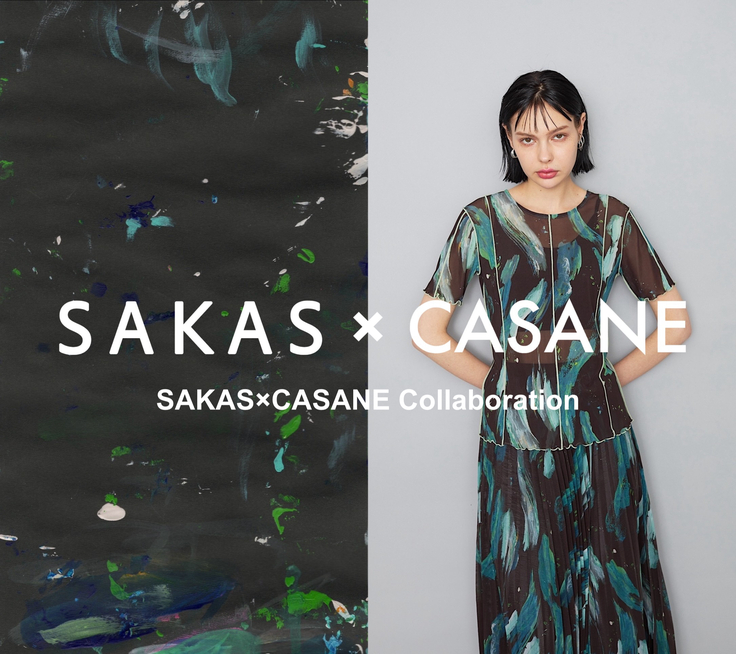 SAKASアーティストの篠田幸利さんのアートをデザイン化し、CASANEの人気商品であるニュアンスアートメロートップスとニュアンスアートプリーツスカートに落とし込みました。篠田さんのセンスの良い色使いがCASANE人気商品であるニュアンスアートメロートップスとニュアンスアートプリーツスカートにアップデートされお洒落な仕上がりで限定発売となりました。