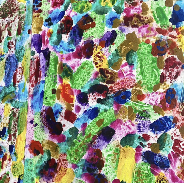 群馬県伊勢崎市生まれ。篠田さんも群馬県にあるNPO法人麦わら屋さんを利用されているアーティストさんです。普段は穏やかな篠田さんですが、作業中は何かに突き動かされたように絵の具で色を塗り続けます。休息もせず黙々と筆を動かす様子は、鬼気迫るものがあります。最初は真っ青だったはずの作品が何度も色を重ねられて真っ赤になっていた、ということもしばしばあるそうです。「小童」という字モチーフにした絵や立体作品など多岐に渡り、絵の具が幾重にもなった作品には重厚感が漂います。バランスの取れたセンスの良い鮮やかな色彩の抽象画が特徴です。様々な美術館やアートギャラリーの出展の経歴もあります。↓下のアートがトップスとスカートの原画となります。センスの良い色使いが特徴的です。