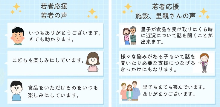 児童養護施設を巣立った若者を中心に食品などを届ける事が出来ています。