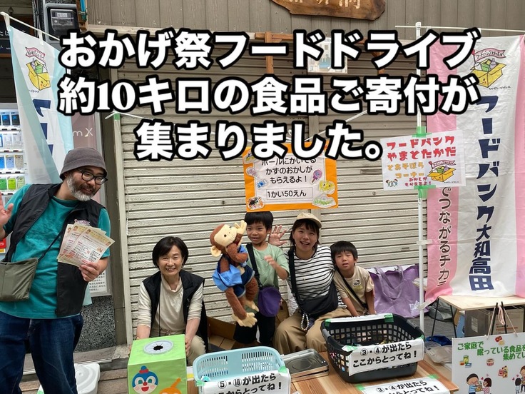 大和高田市の片塩商店街一帯で開催された、おかげ祭りの初日にフードドライブとお菓子くじ引きを行いました。