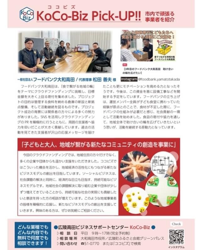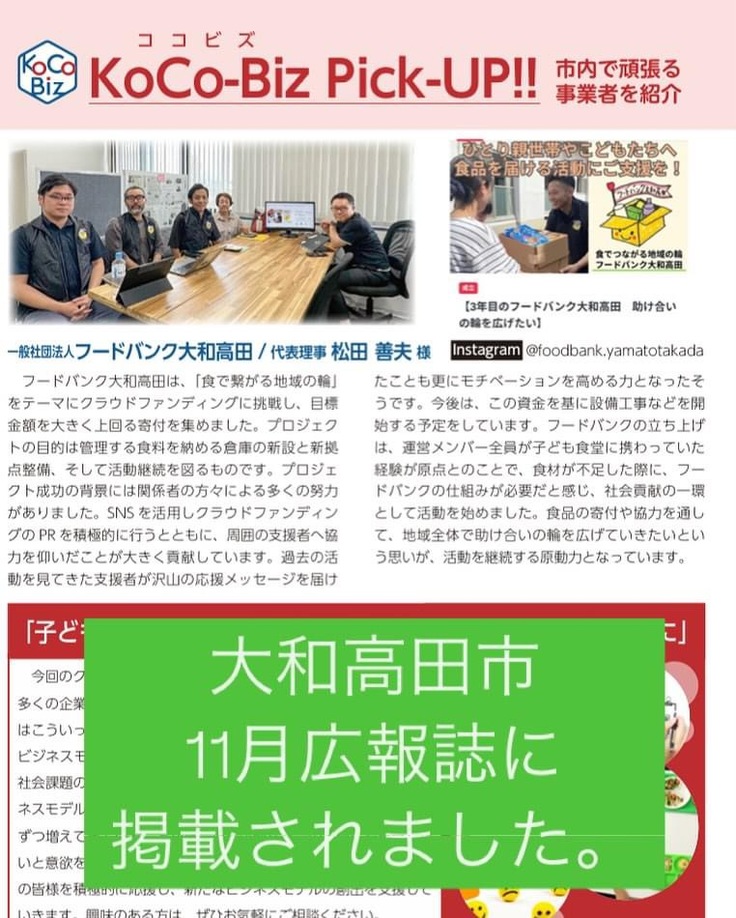 大和高田市の広報誌「やまとたかだ」2024.11月号に、広陵高田ビジネスサポートセンターKoCo-Biz(ココビズ)さんが市内で頑張る事業者を紹介するページで、フードバンク大和高田の活動などについて、掲載していただきました。