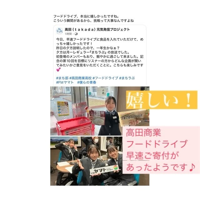 高田商業生のフードドライブに早速ご寄付があったようです😊