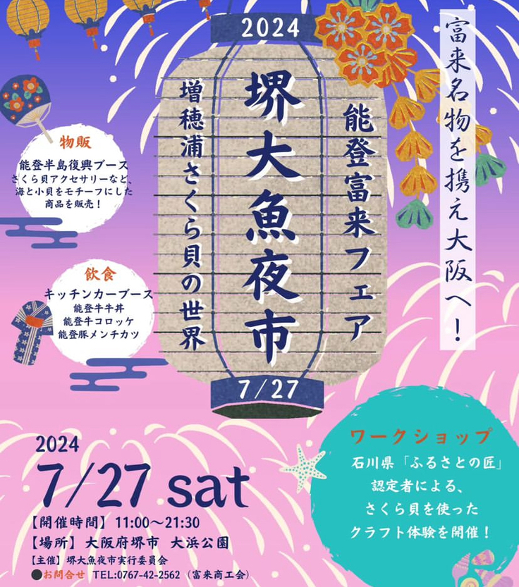 この度、富来商工会様にお声かけ頂き、大阪府堺市で700年前から開催されている、堺大魚夜市の能登復興ブースにて当店の商品を出品させて頂きます。