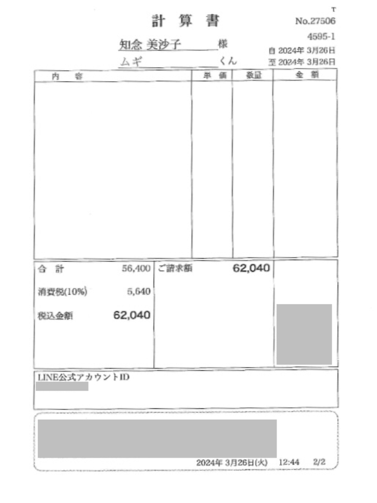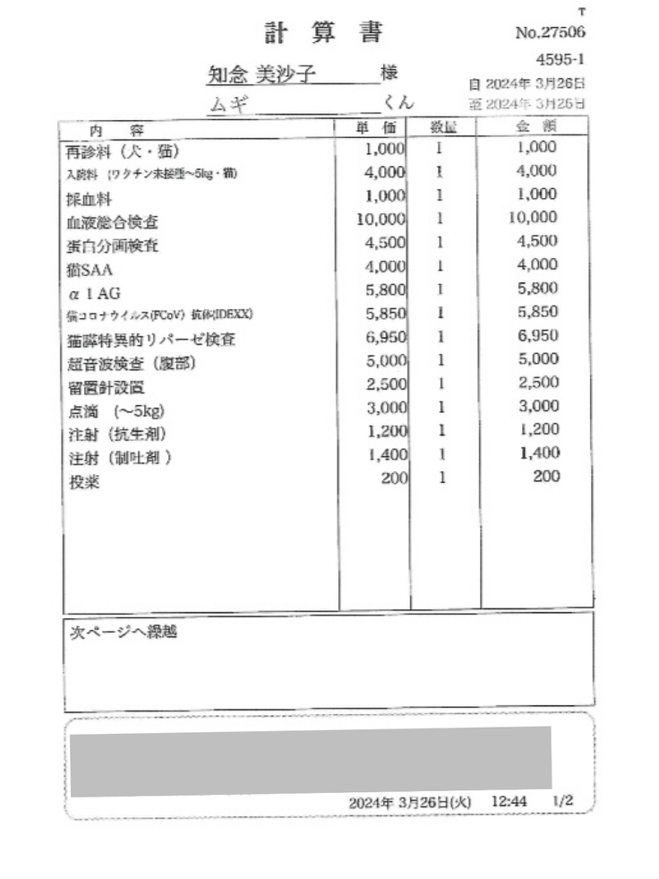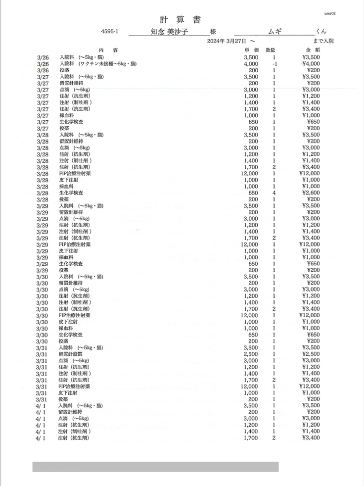 むぎくんの状態により、84日間で治療終了できないことや、体重増加に伴い 薬代が上がることもありますが、今回は、現状のまま84日間で投薬完了出来たとして薬代の計算をいたしました。