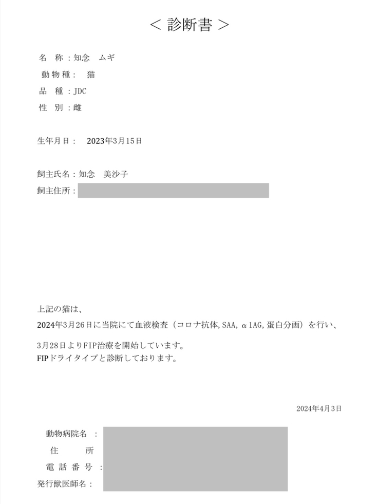改めてその時にも FIP(猫伝染性腹膜炎)の検査をしましたが、発症していないということでした。