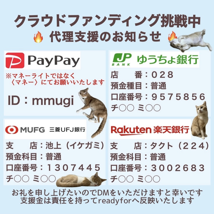 ※ クラウドファンディングが達成できなかった場合、代理支援で頂いた支援金は返金せずに全額をむぎの治療費に充てさせていただくことをご了承ください。