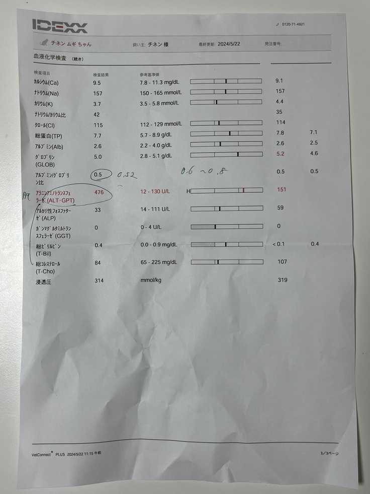 アルブミンは栄養状態を測る指標になるようで、猫の正常値2.1〜3.4。