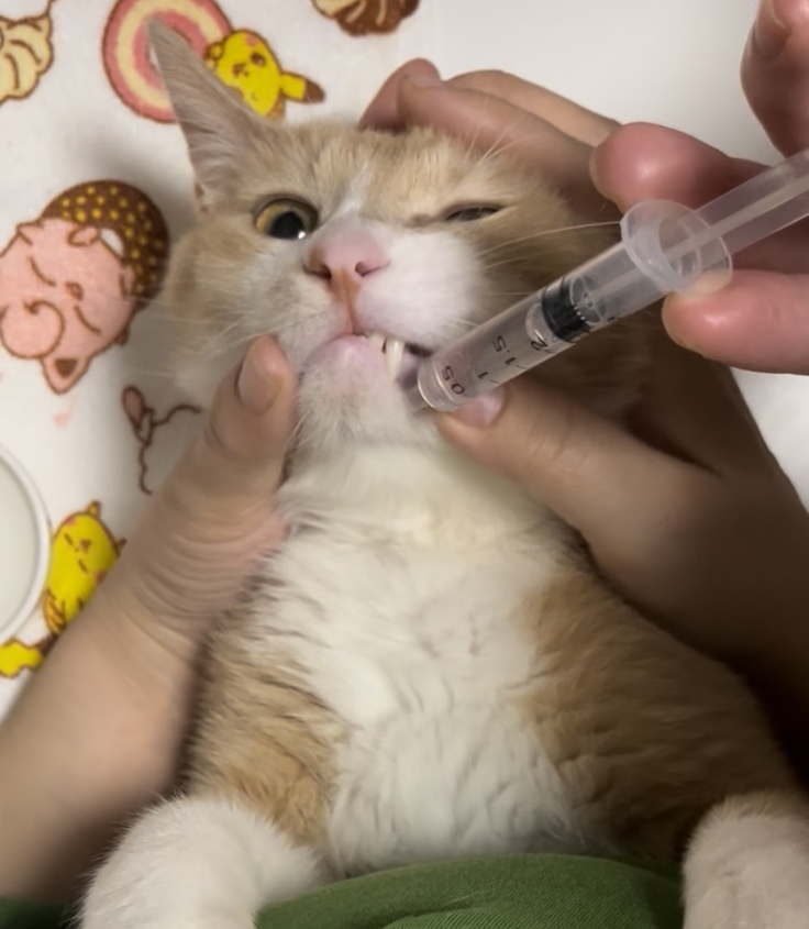 先生からは「お薬は水だけで与えてください」と説明を受けているので、指で口を開かせて、水で錠剤を流し込むようにしています。
