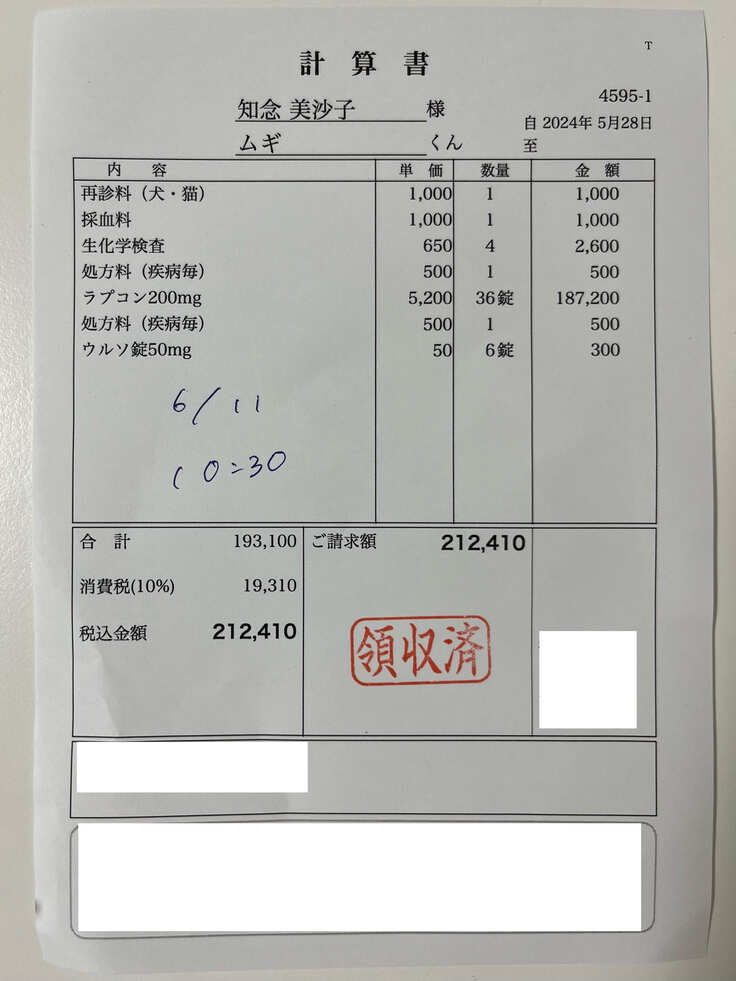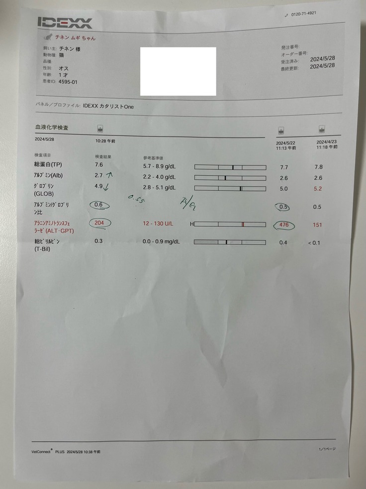 アルブミンの数値が上がっているかと、肝臓のお薬を6日間服用した結果を確認するために、血液検査をしていただきました。