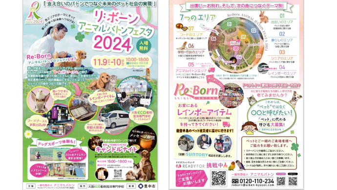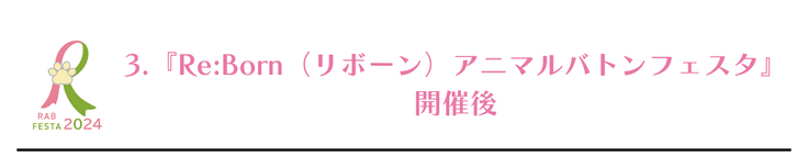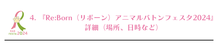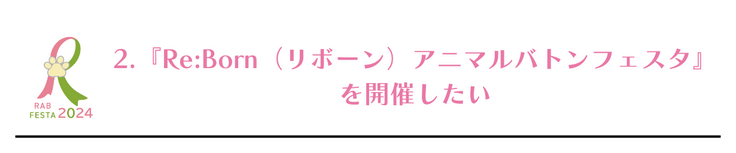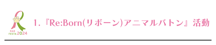 『Re:Bornアニマルバトンフェスタ2024』の開催により、『Re:Bornアニマルバトン』活動を多くの人に知って頂き、次の命に使えるレインボーアイテムを一つでも多く集めるために、どうか、皆様のご支援とご協力をよろしくお願い致します。