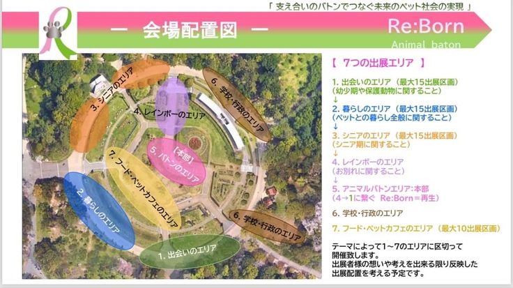 このイベントでは会場に7つのエリアを設け、出会いから別れ、そして別れが最期ではなく、それを出会いにつなぐ命のバトンをご来場者様と共に体験できる事を考えています。