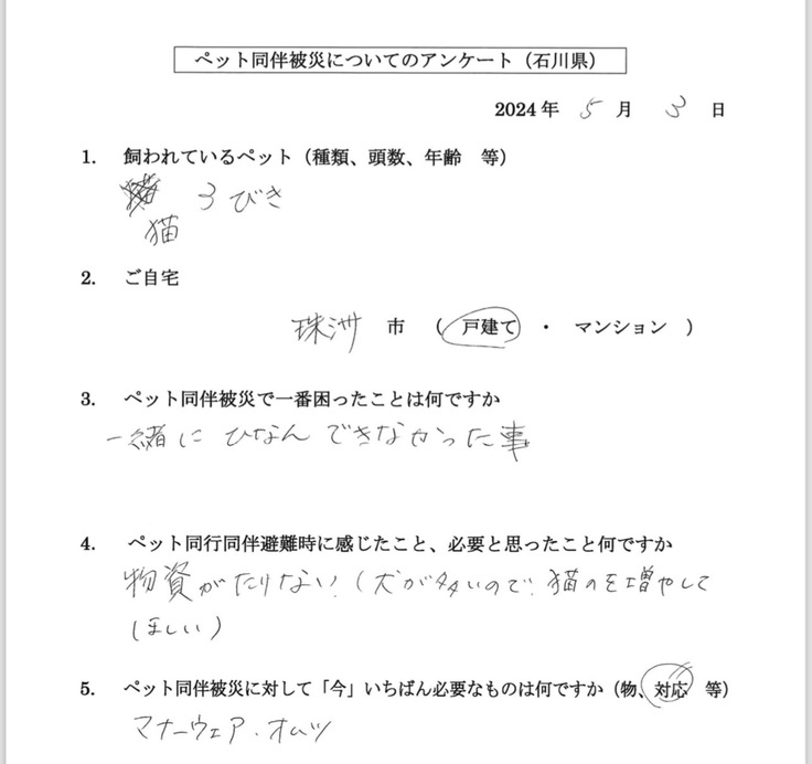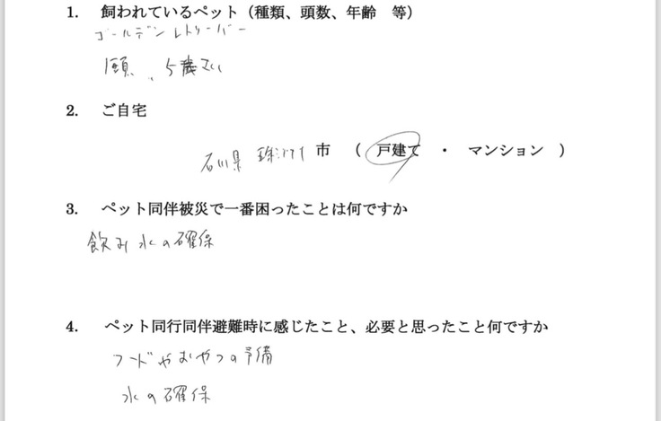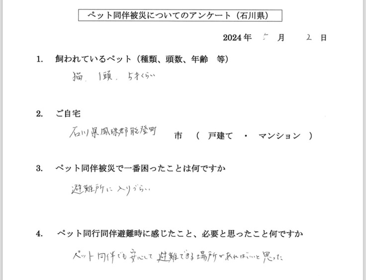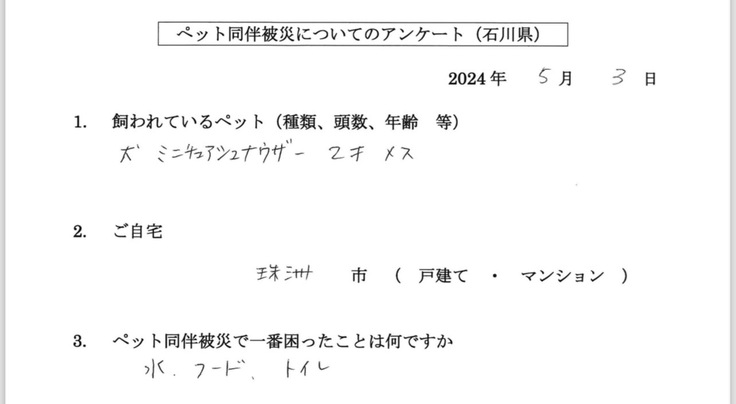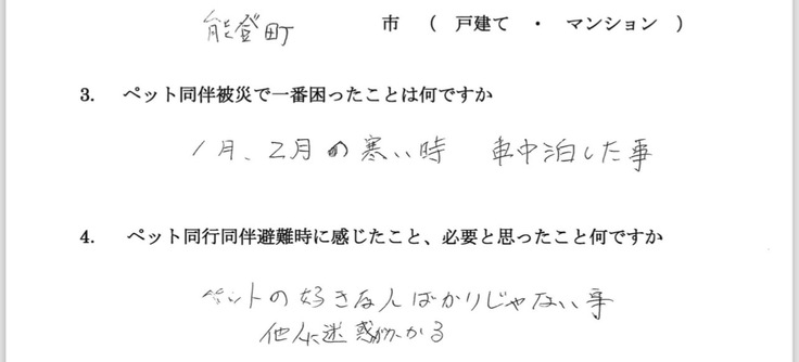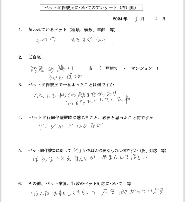 他の避難者もおられ、ペットの事を自由に話せるという当たり前のことすらできなくなっている避難生活の中で、ペットの事で支援に来た私たちに対しての笑顔と長い話、そして離れる時の寂しそうに見える姿が強く印象に残っています。